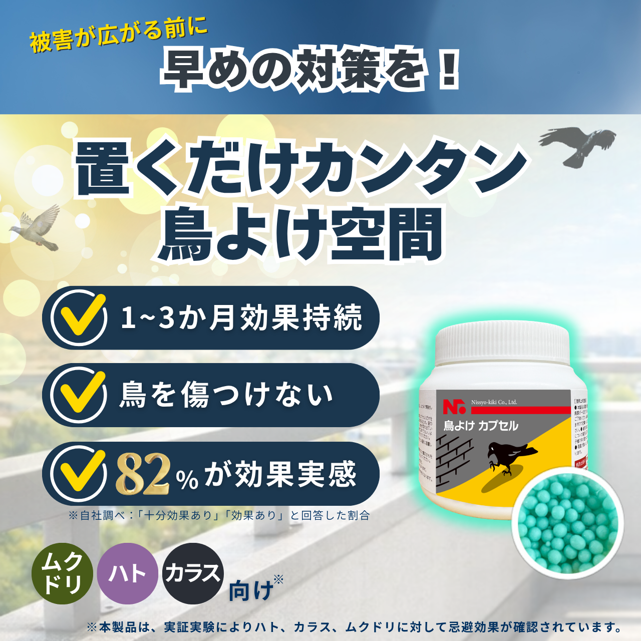 本製品は、ニオイのチカラで鳥に“ここは危険”と感じさせ、近づくのを防止する忌避カプセル。