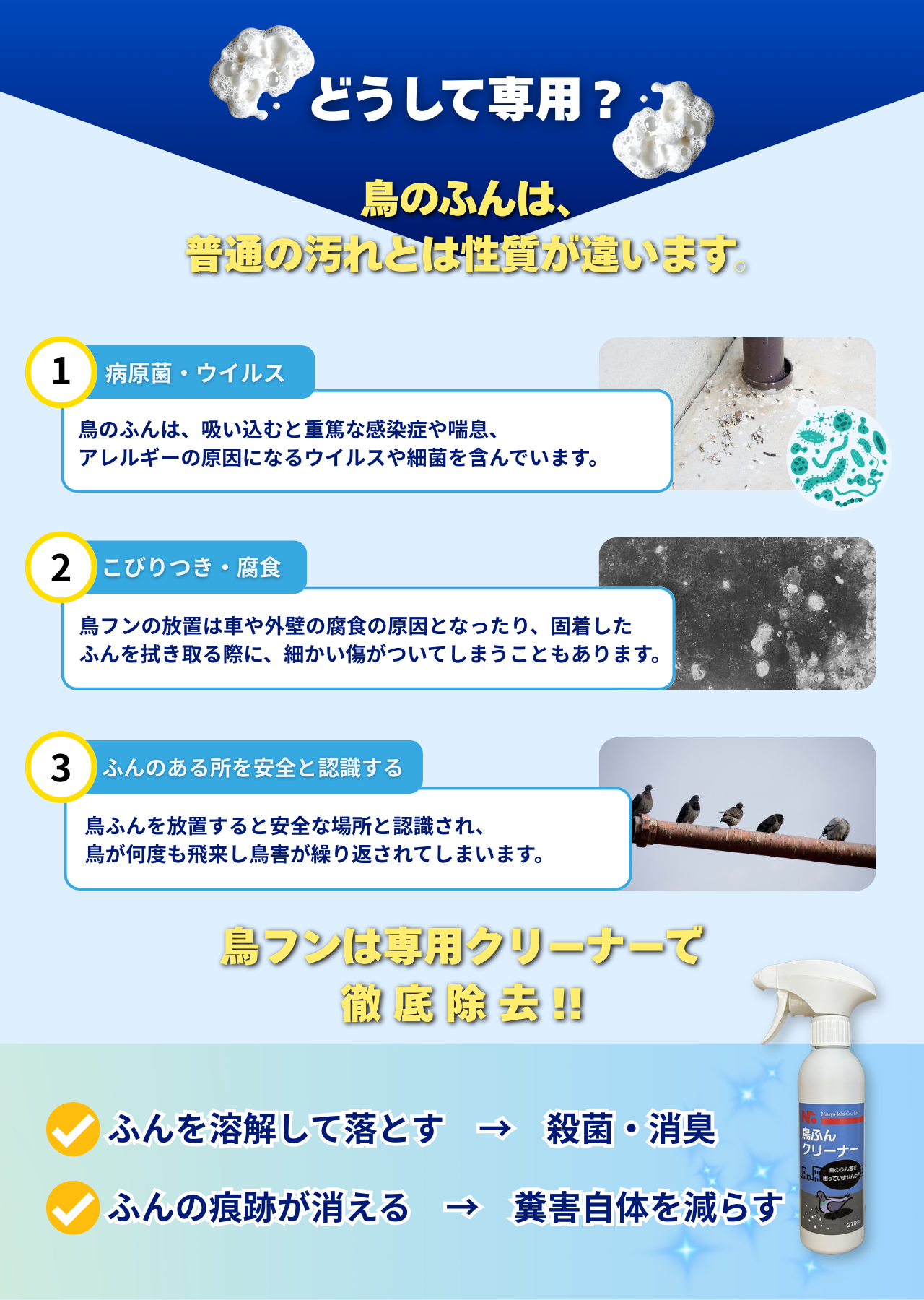 本製品は、鳥のフン特有の頑固な汚れ、その原因となるたんぱく質や脂質を徹底的に分解するために、専用処方で開発された強力クリーナーです。