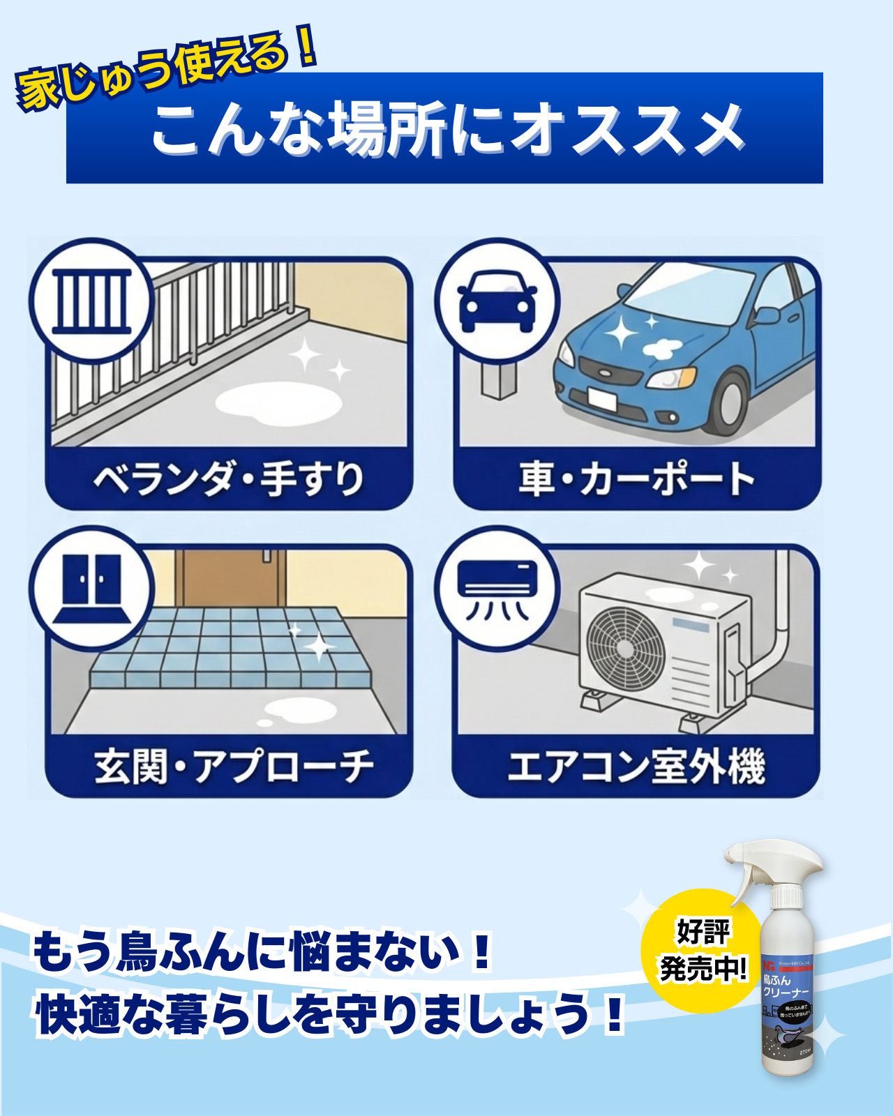 使用対象:一般住宅から、商業施設、病院、学校、工場、公園、車など鳥類の排泄物で汚れた場所