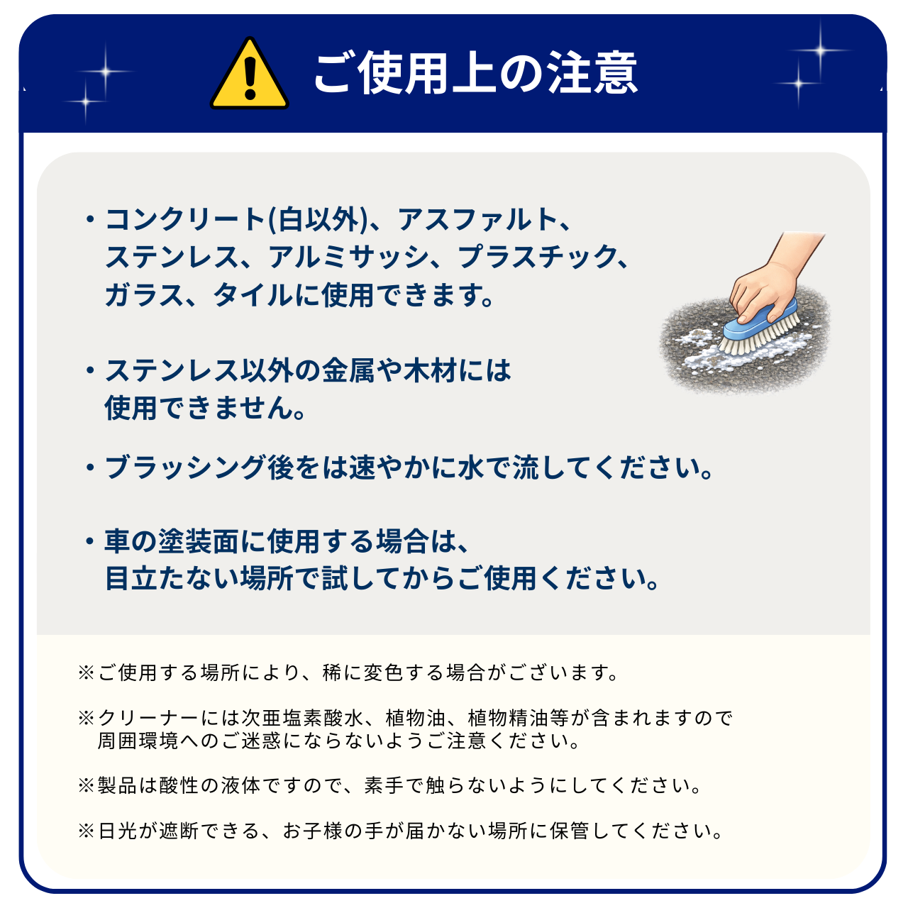 ※クリーナーには次亜塩素酸水、植物油、植物精油等が含まれますので周囲環境へのご迷惑にならないようご注意ください。