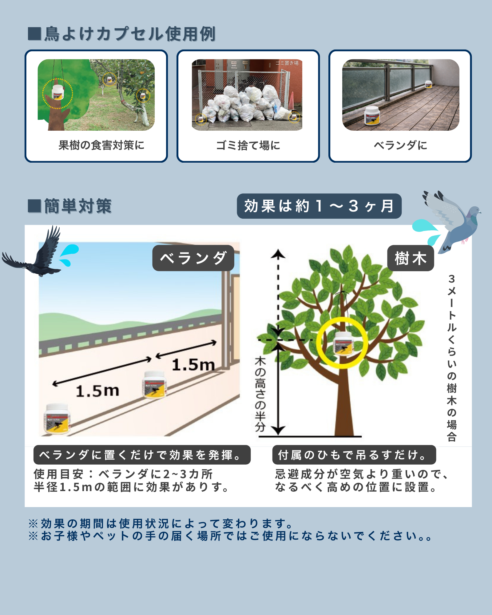 使用箇所:鳥類が寄り付く場所、鳥類がとまる場所(ゴミ集積場、樹木など)