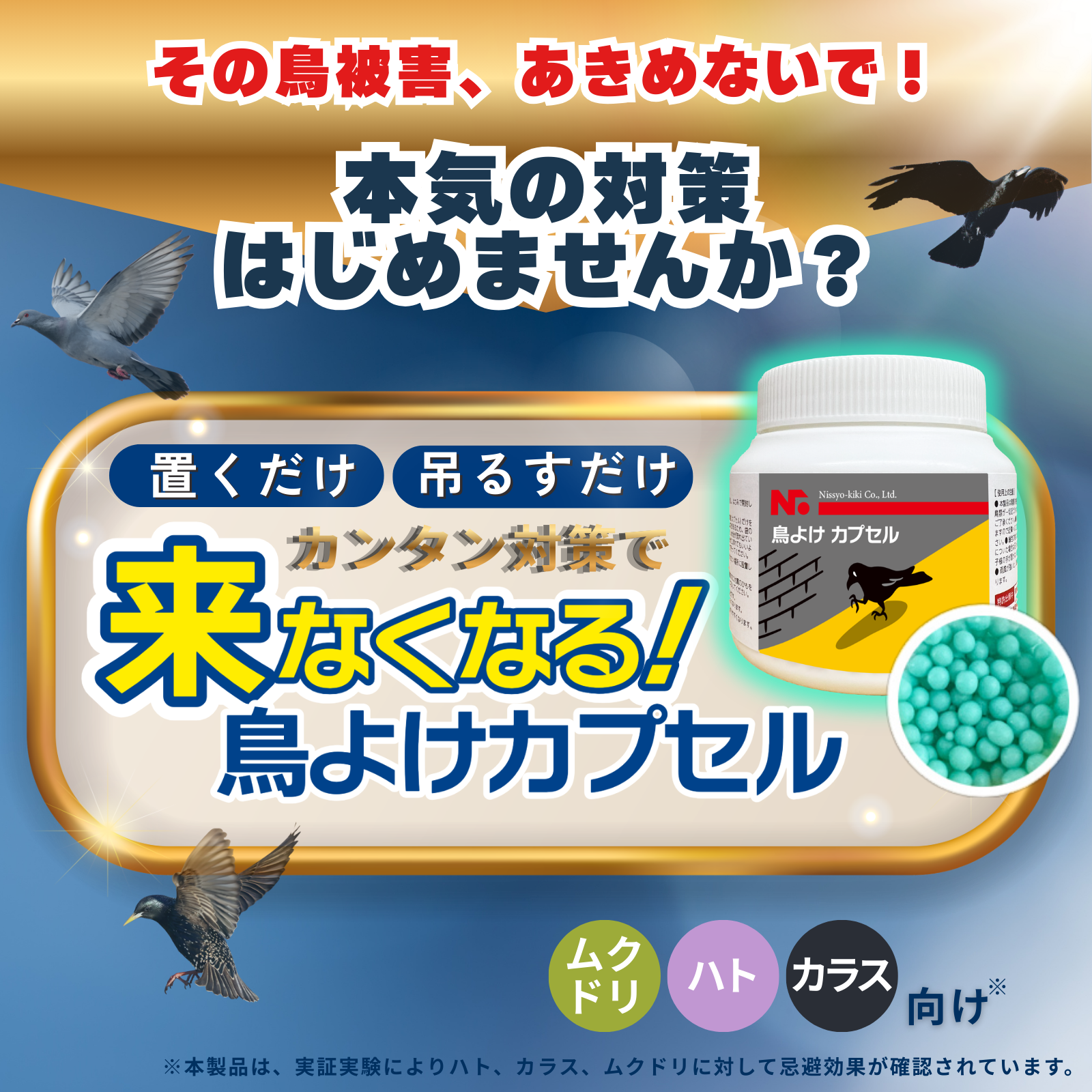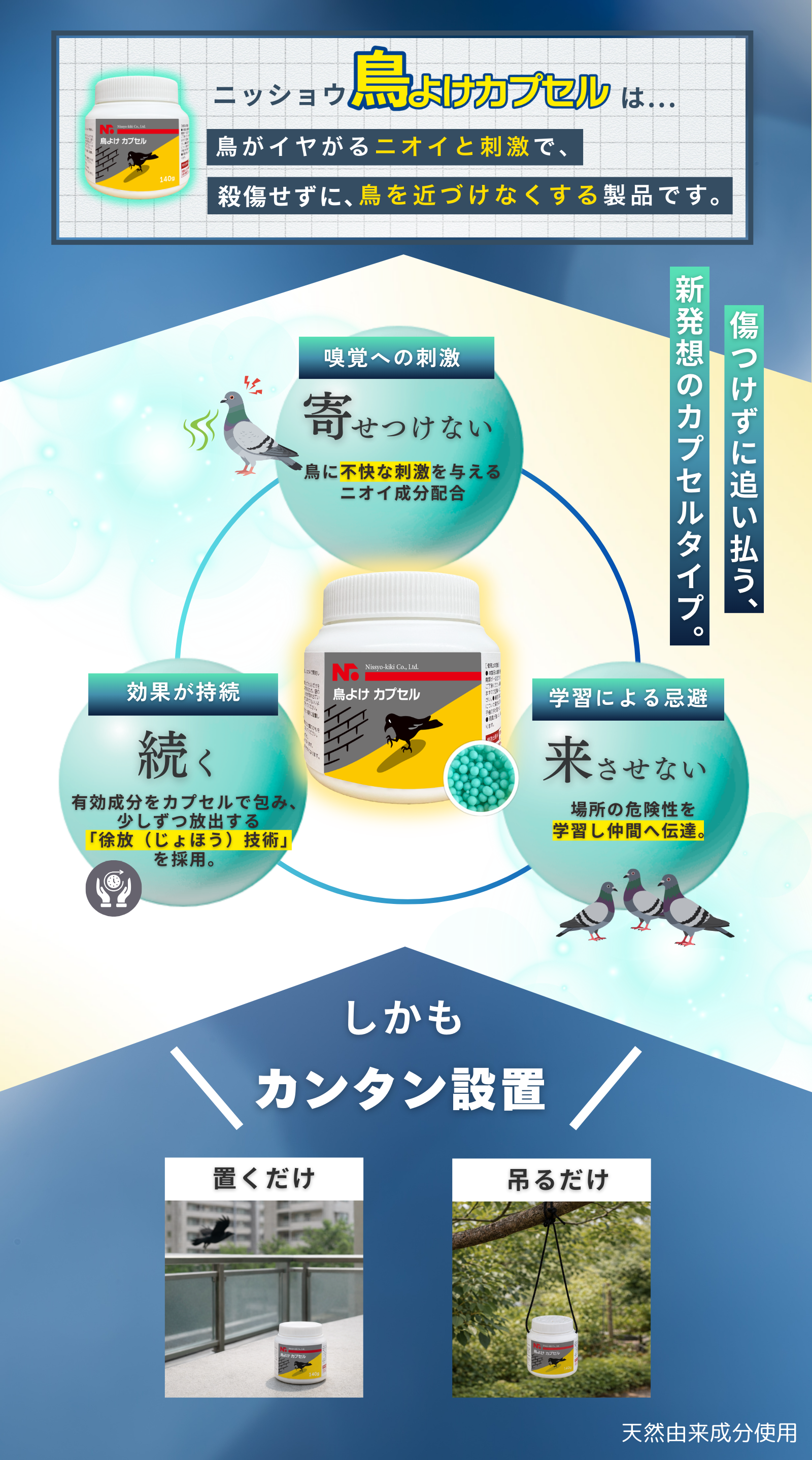 ニッショウ鳥よけカプセルは、「吊るす・置くだけ」で鳥を寄せつけない、超お手軽・高効果の忌避剤です。