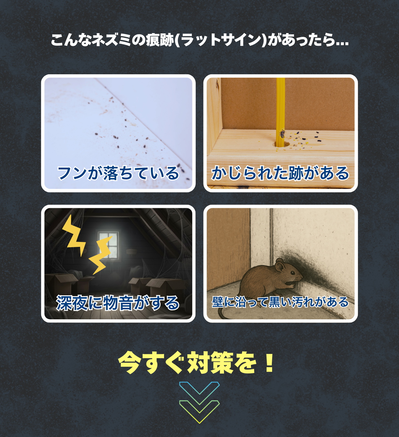 ネズミ被害(かじり跡、糞、足跡など)が発生しているところ、ネズミの侵入口や通路周辺。