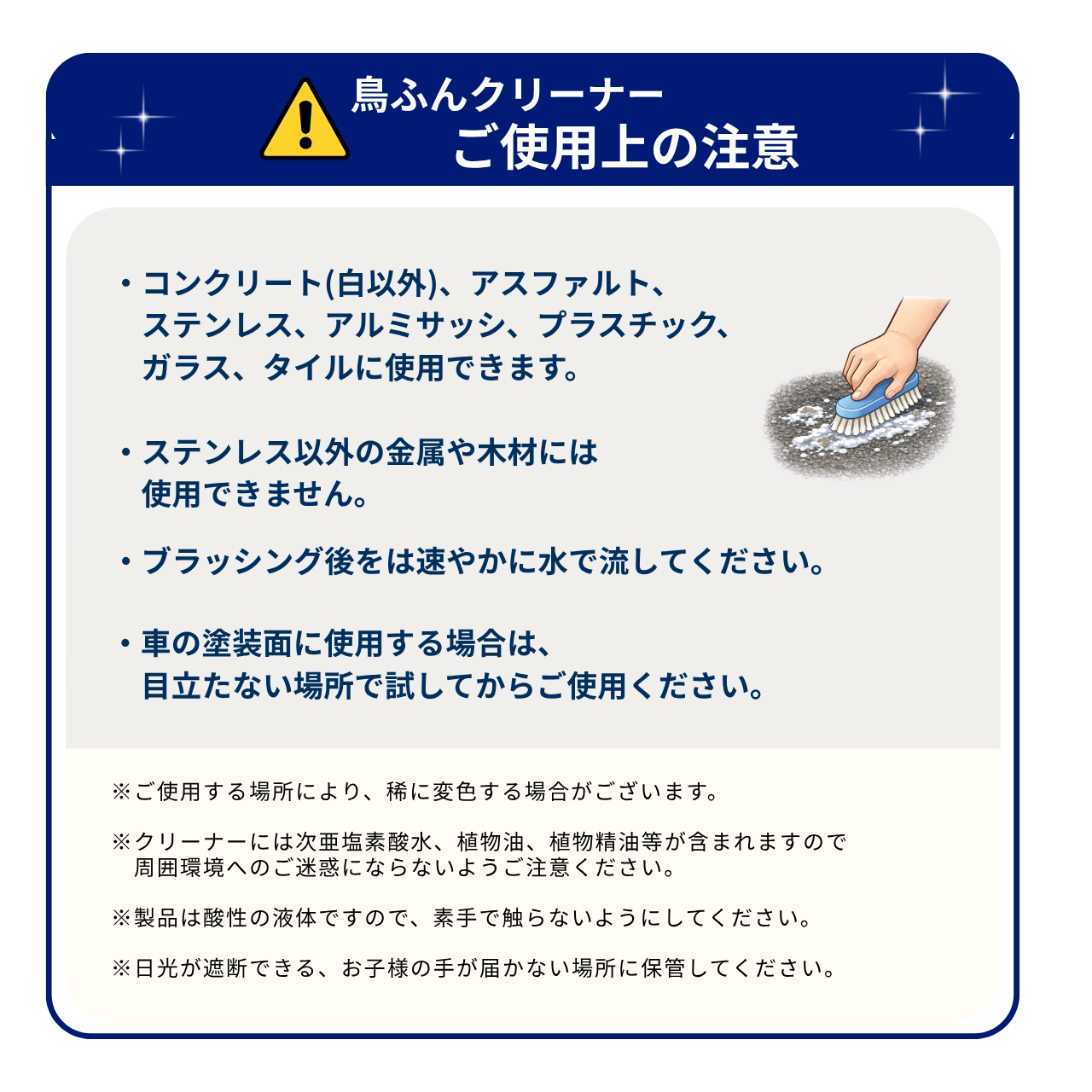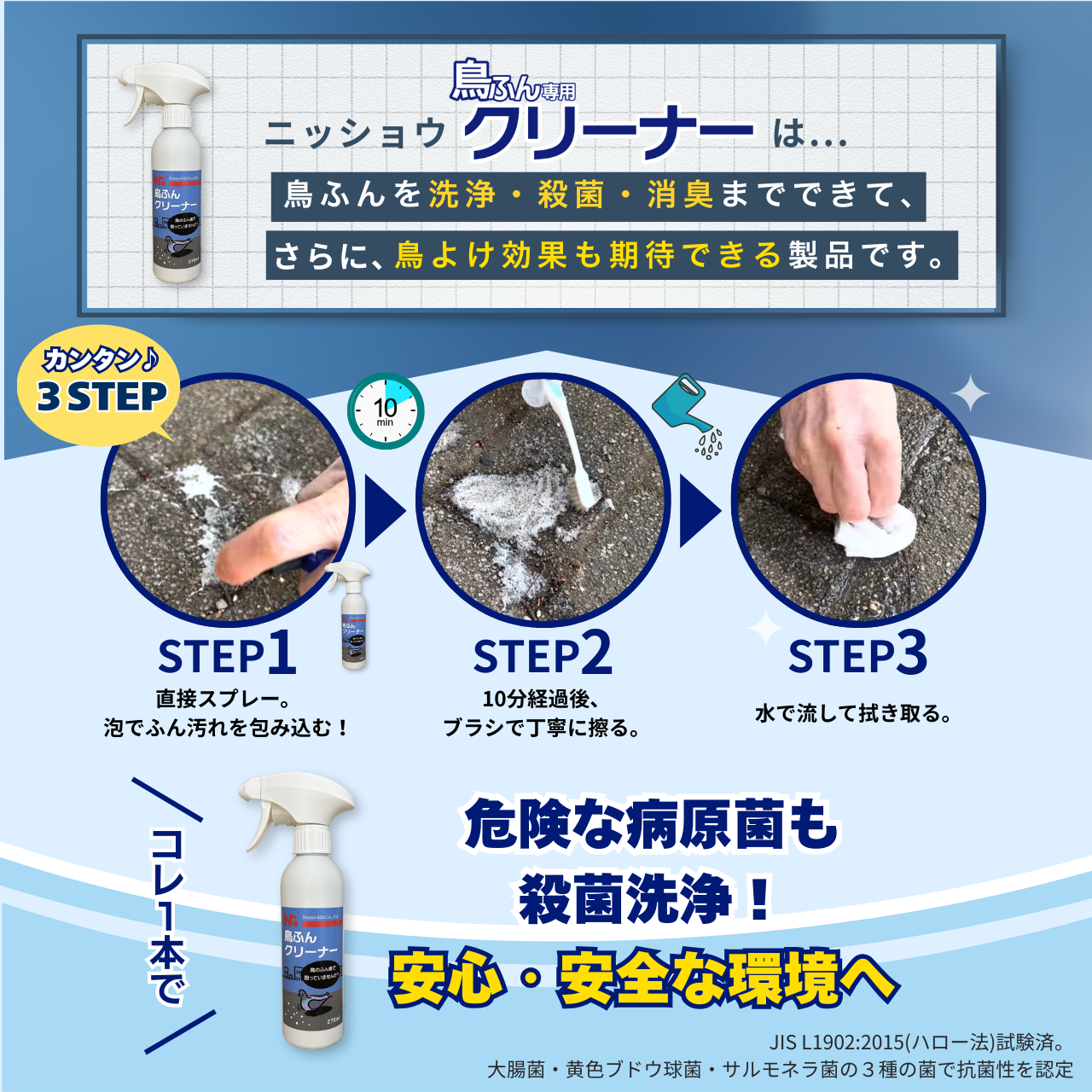 使用対象:一般住宅から、商業施設、病院、学校、工場、公園、車など鳥類の排泄物で汚れた場所