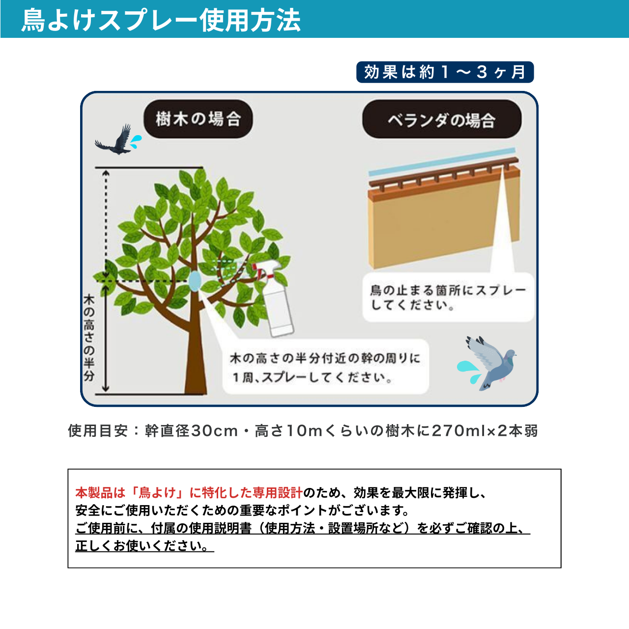 ※鳥類忌避剤スプレーにはアルコール、エステル系着香料、辛み成分、植物精油等が含まれますので周囲環境へのご迷惑にならないようご注意ください。