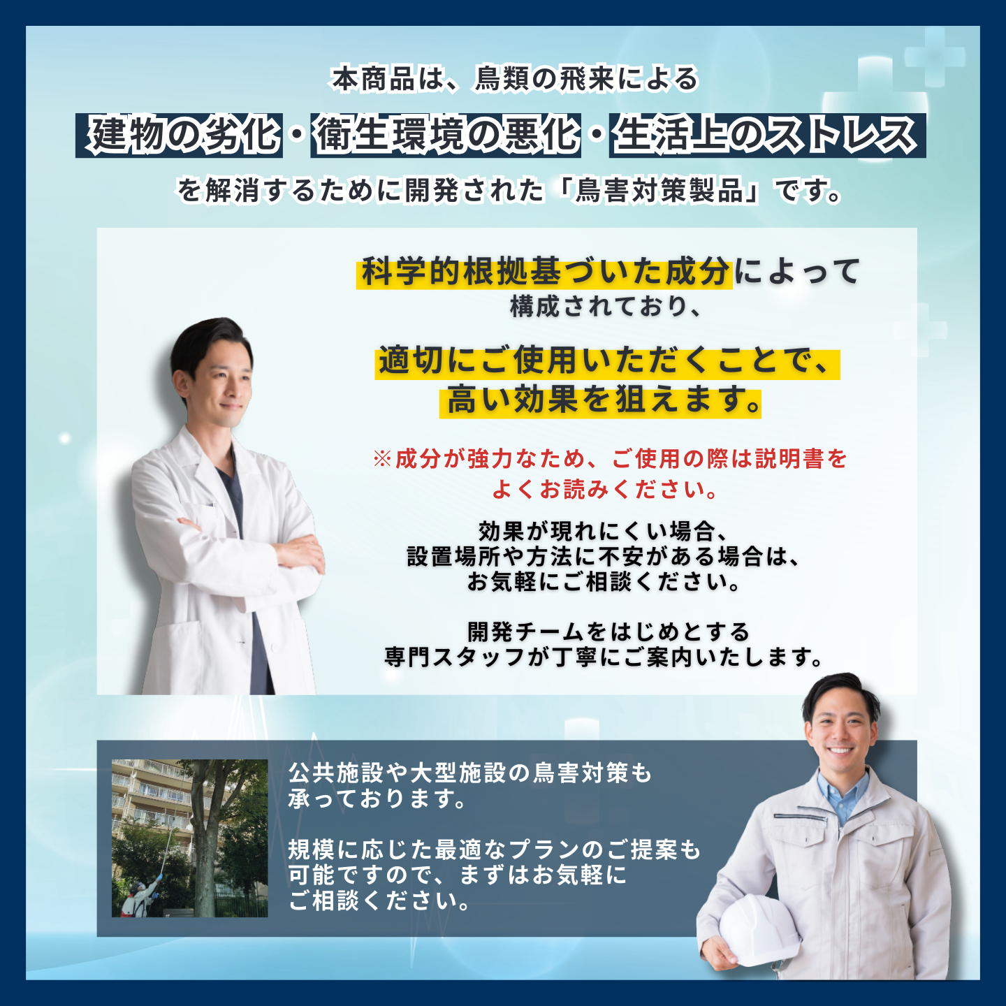 鳥類による被害・糞や鳴き声など様々な鳥害に対して効果を発揮します。